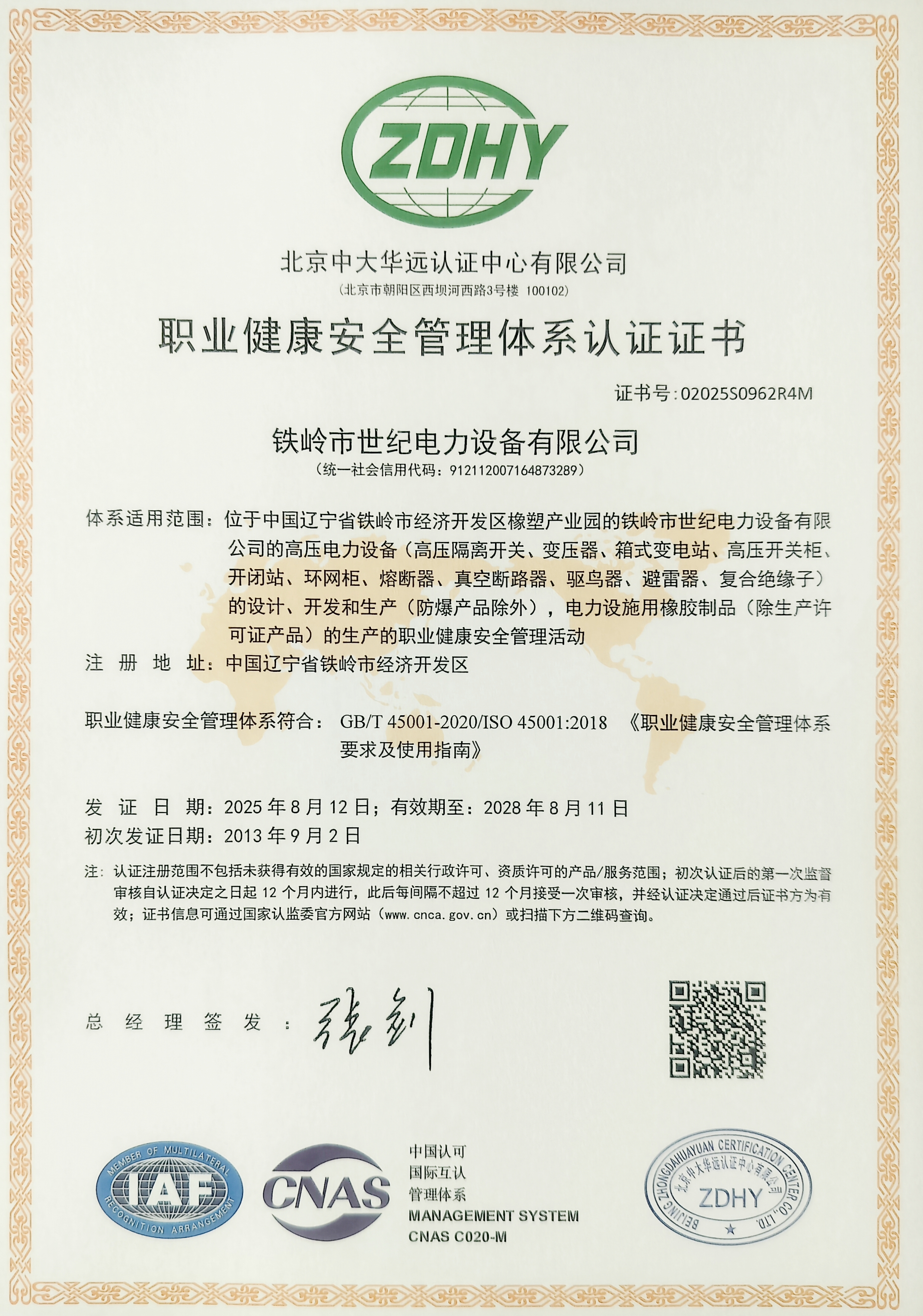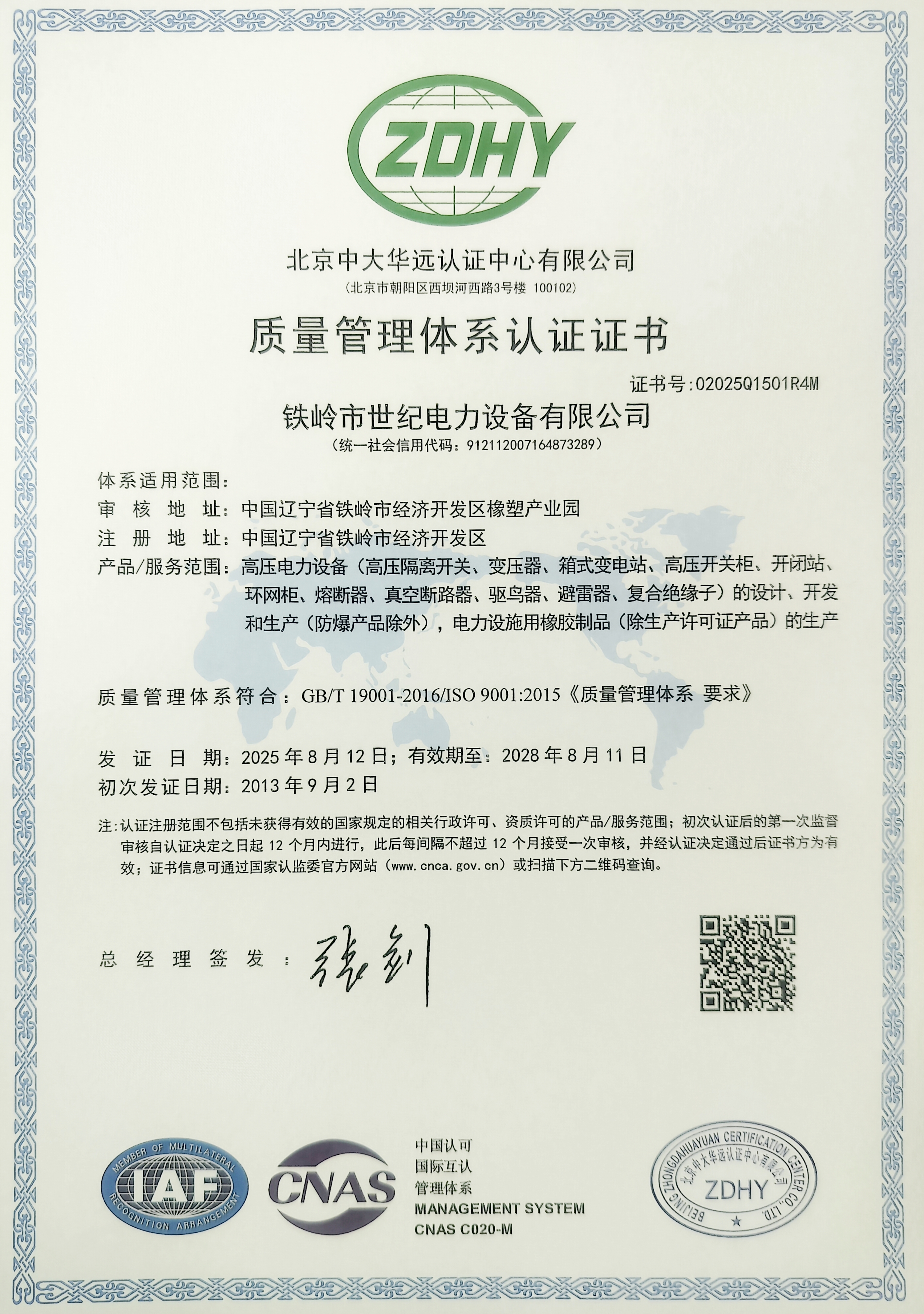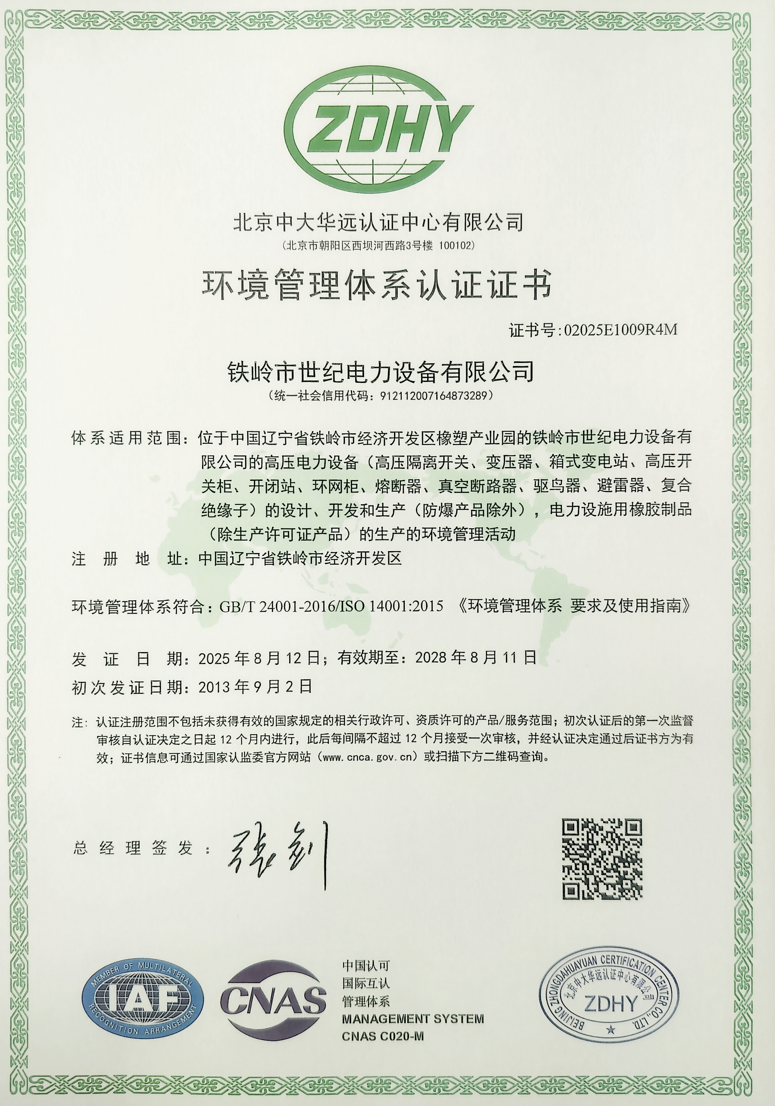 鐵嶺市世紀(jì)電力設(shè)備有限公司是集科研開(kāi)發(fā)、生產(chǎn)制造、用戶服務(wù)于一體的國(guó)家高新技術(shù)企業(yè),始建于1999年,位于鐵嶺經(jīng)濟(jì)開(kāi)發(fā)區(qū),占地面積5萬(wàn)余平方米,建筑面積2萬(wàn)余平方米。主要從事國(guó)家電網(wǎng)配套戶外高低壓隔離開(kāi)關(guān)、電力電纜、變壓器成套裝置、高低壓開(kāi)關(guān)柜、箱式變電站、絕緣子等產(chǎn)品的研發(fā)、生產(chǎn)和銷售。公司現(xiàn)有國(guó)家發(fā)明專利6項(xiàng)、實(shí)用新型專利9項(xiàng),公司通過(guò)了ISO9001國(guó)際質(zhì)量管理體系認(rèn)證、ISO14001環(huán)境管理體系認(rèn)證和ISO 45001職業(yè)健康安全體系認(rèn)證。